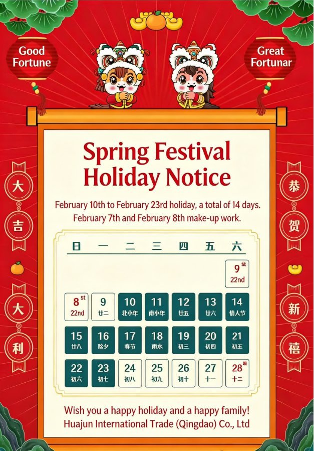 The Chinese New Year is a time of reunion, hope, and new beginnings. On this joyful occasion, Huajun International Trade (Qingdao) Co., Ltd warmly wishes you and your family a happy, healthy, and prosperous Spring Festival. May the Year ahead bring success, growth, and new opportunities to all.